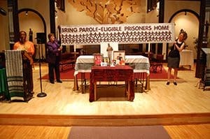 Racine Dominican Sr. Fran Hoffman, member of WISDOM’s Madison affiliate, MOSES, made a banner that was displayed at the parish during the event that read “Bring Parole-Eligible Prisoners Home.”