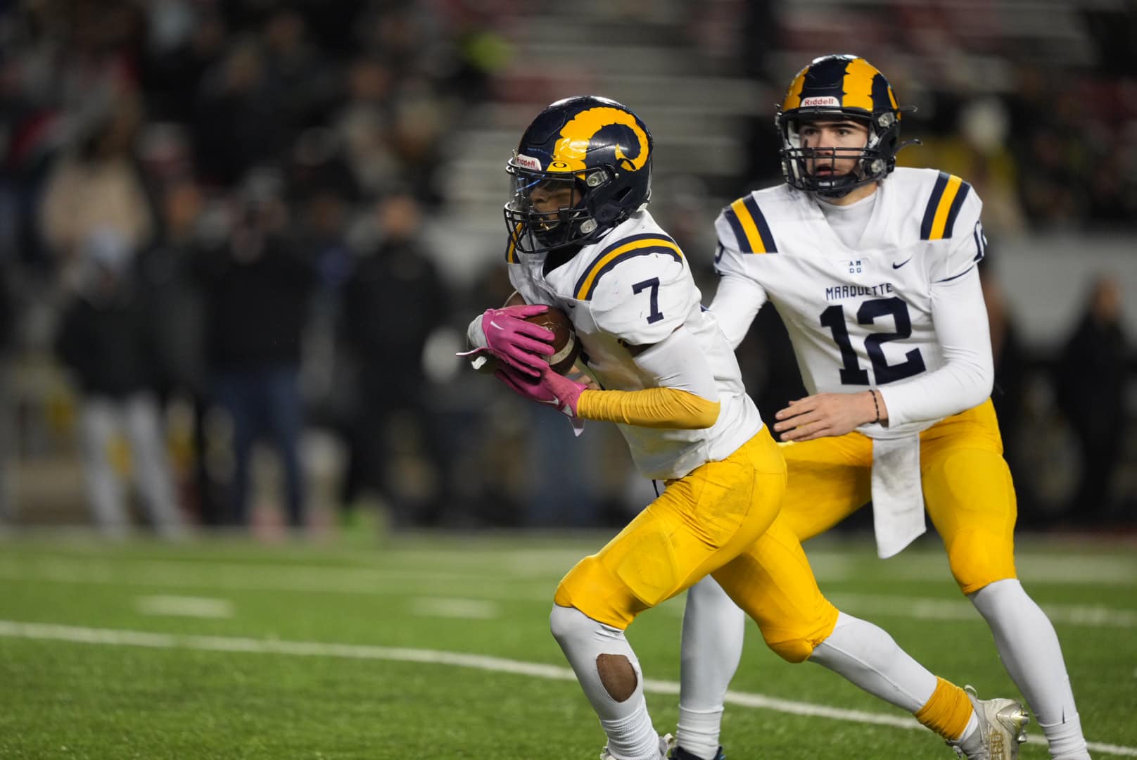 Tommy Novotny, shown in the 2023 state championship game against Franklin, is entering his junior season as the starting running back for Marquette University High School, Milwaukee. (Submitted photo)