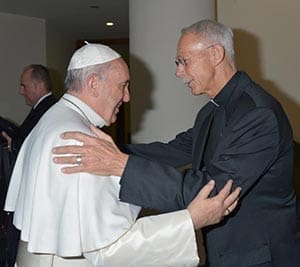 Pope Francis and Jesuit Fr. John Schlegel embrace following a morning Mass on March 26 in the Domus Sanctae Marthae. Fr. Schlegel was one of 12 concelebrants at the Mass. (Submitted photo courtesy Fr. John Schlegel)
