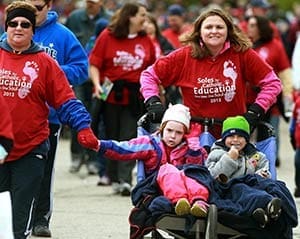 Anne Kasdorf, left, and Katie Carnell, pushing a stroller with Catherine Carnell, 6, and Matthew Carnell, 4, as passengers are among the more than 7,000 participants in the inaugural Soles for Catholic Education 2-mile Walk Nov. 2 at Mount Mary University, Milwaukee. (Catholic Herald photo by Allen Fredrickson)strengthening the infusion of Catholic teachings in all courses.