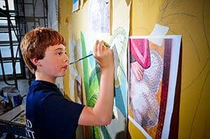 “He’s really talented, but we want to focus on seeing that he has a great time, loves it and is introduced to some different techniques,” said Andrews of the pint-sized artist with the shock of bright red hair and big, brown eyes who will be in fifth grade at Quinn Middle School in Hudson, Mass., in the fall. “Looking at his work, he has the most important elements of artistry, he knows how to conceptualize things. Things like learning how to hold a brush, he’ll learn over time – that took me many years – but he has the ability to render and mix colors,” according to Andrews who has worked on restoration of St. Josaphat Basilica, Milwaukee, the Basilica of Holy Hill, Hubertus, and St. Louis Cathedral in New Orleans, among many others.