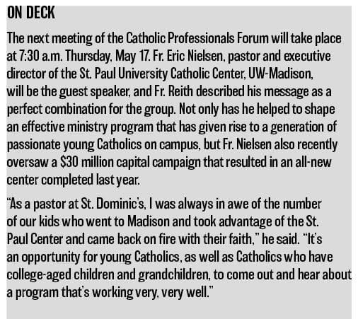 The gatherings are held from 7:30 to 9 a.m. every third Thursday of the month at Westmoor Country Club, 400 S. Moorland Road, Brookfield. The forums start with networking and breakfast, followed by a guest speaker. The group’s spiritual director, Fr. David Reith, said that their mission rests on four pillars — “to strengthen our relationships with Christ as businessmen and women, to strengthen our integrity as Christians giving witness in the business world, to strengthen our Catholic/Christian faith, and to strengthen our business relations and connections.”