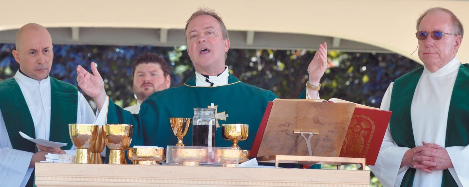 Fr. Jim Volkert celebrates Mass outside a week before the floods that caused heavy damage in Burlington and surrounding areas.