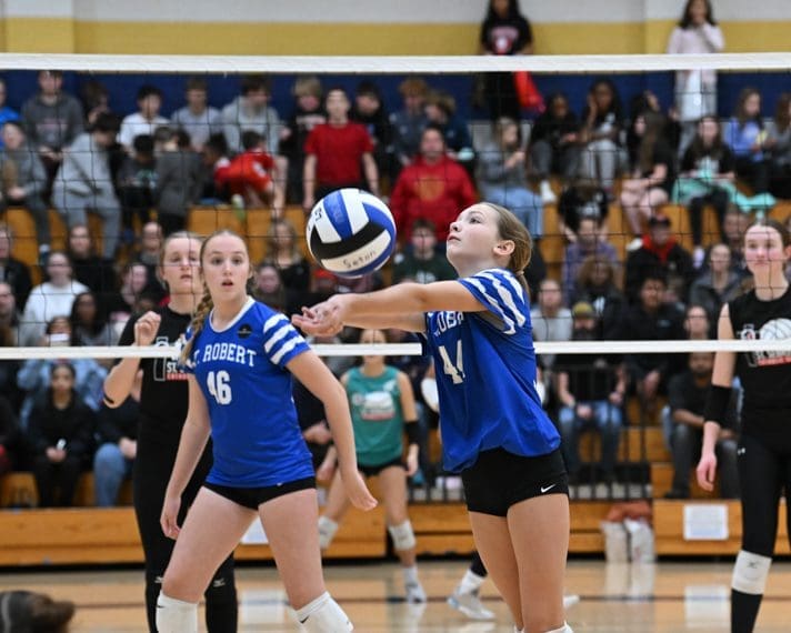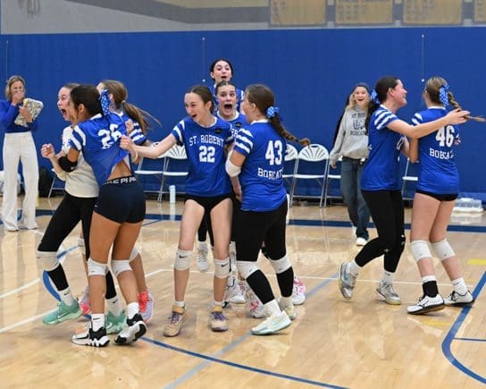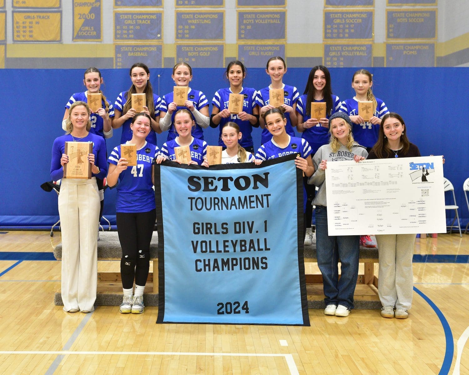 Division 1 Girls: St. Robert, Shorewood, defeated St. Sebastian, Milwaukee, in the Division 1 girls championship by a score of 11-25, 25-20, 11-25, 25-23, 15-8.