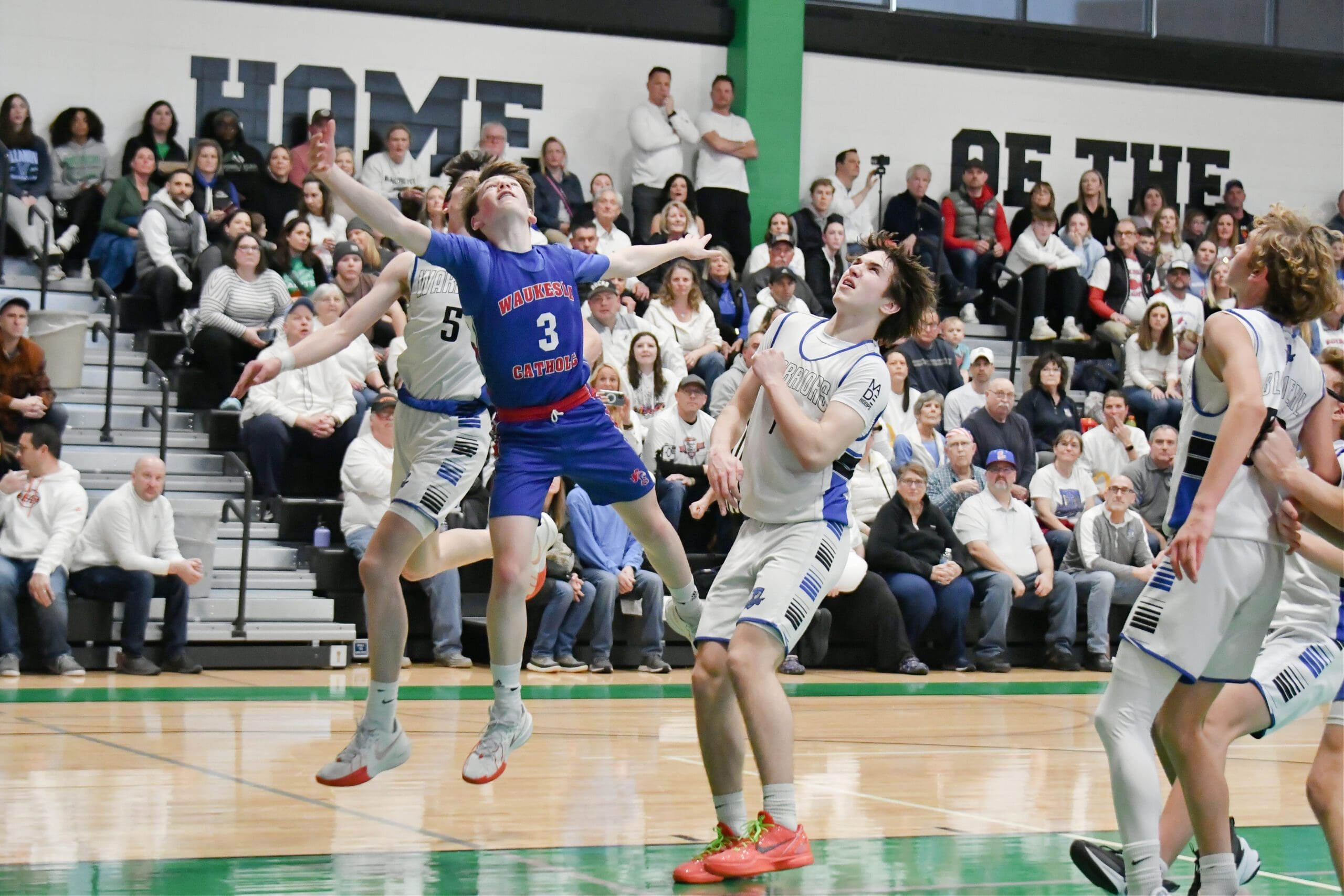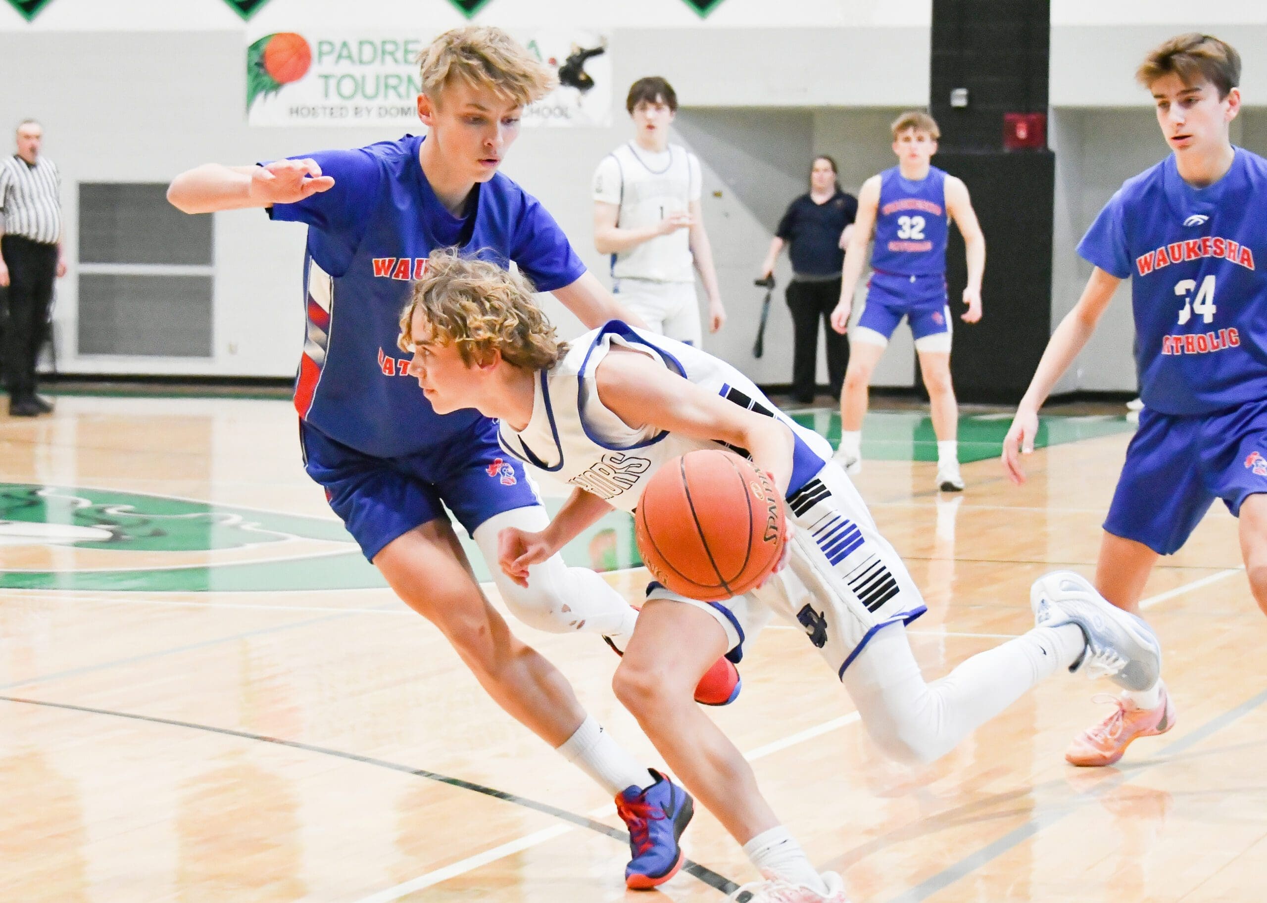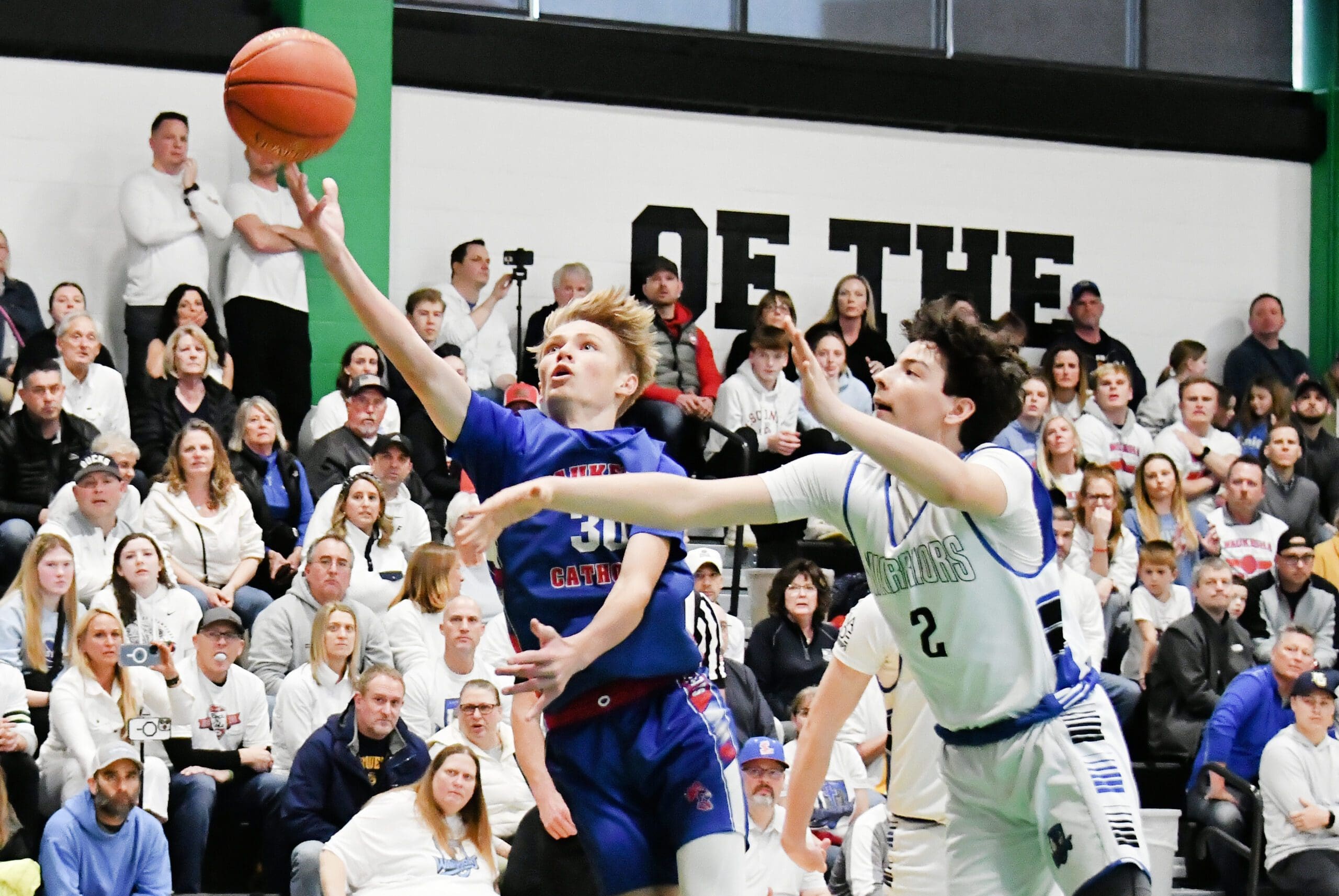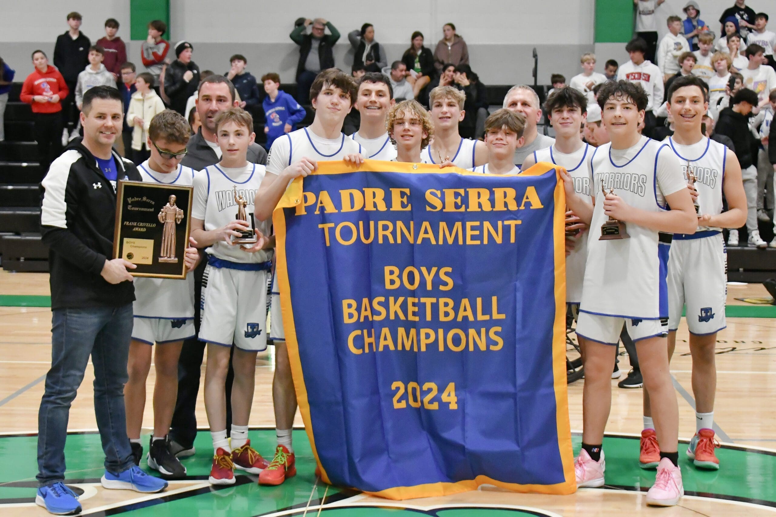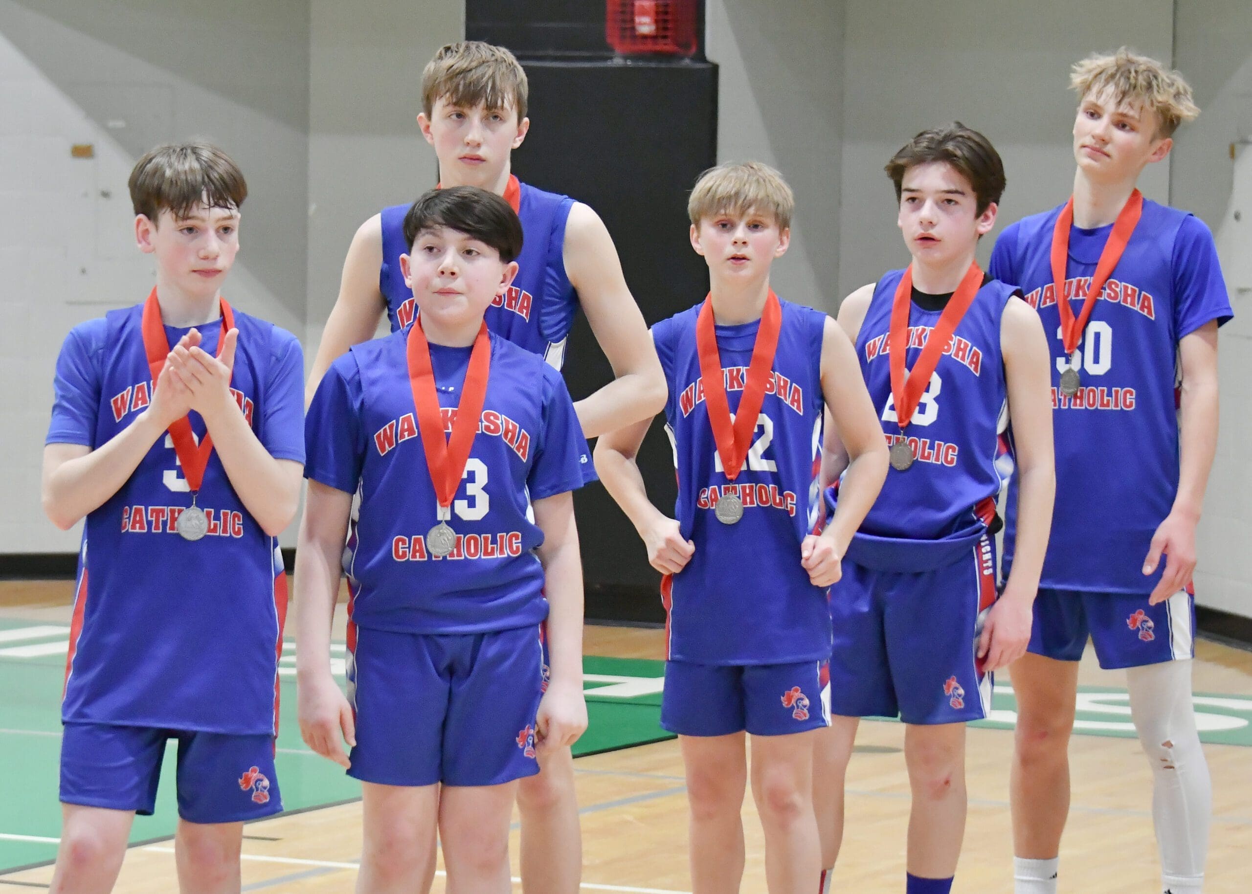 In the championship game of the Padre Serra Boys Basketball Tournament, the St. Mary (Menomonee Falls) Warriors defeated Waukesha Catholic, 50-36, on Sunday, March 24, at Dominican High School, Whitefish Bay. One of the largest grade-school basketball tournaments in the nation, the Padre Serra is run by the Serra Club of Milwaukee, with proceeds benefitting vocations in the Archdiocese of Milwaukee. In the third-place game, Lumen Christi, Mequon, defeated Burlington Catholic, 42-36. (Photos by David Bernacchi)