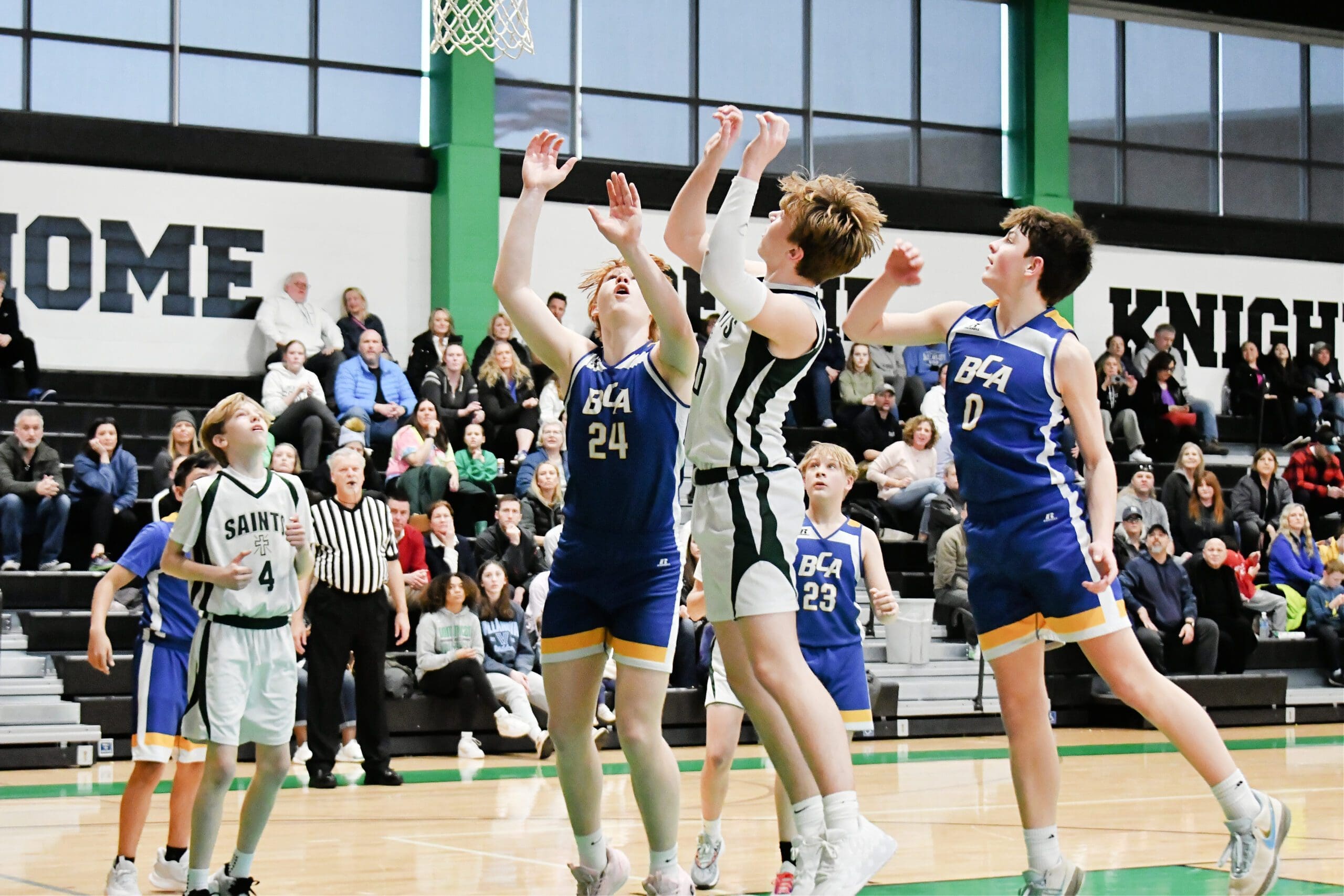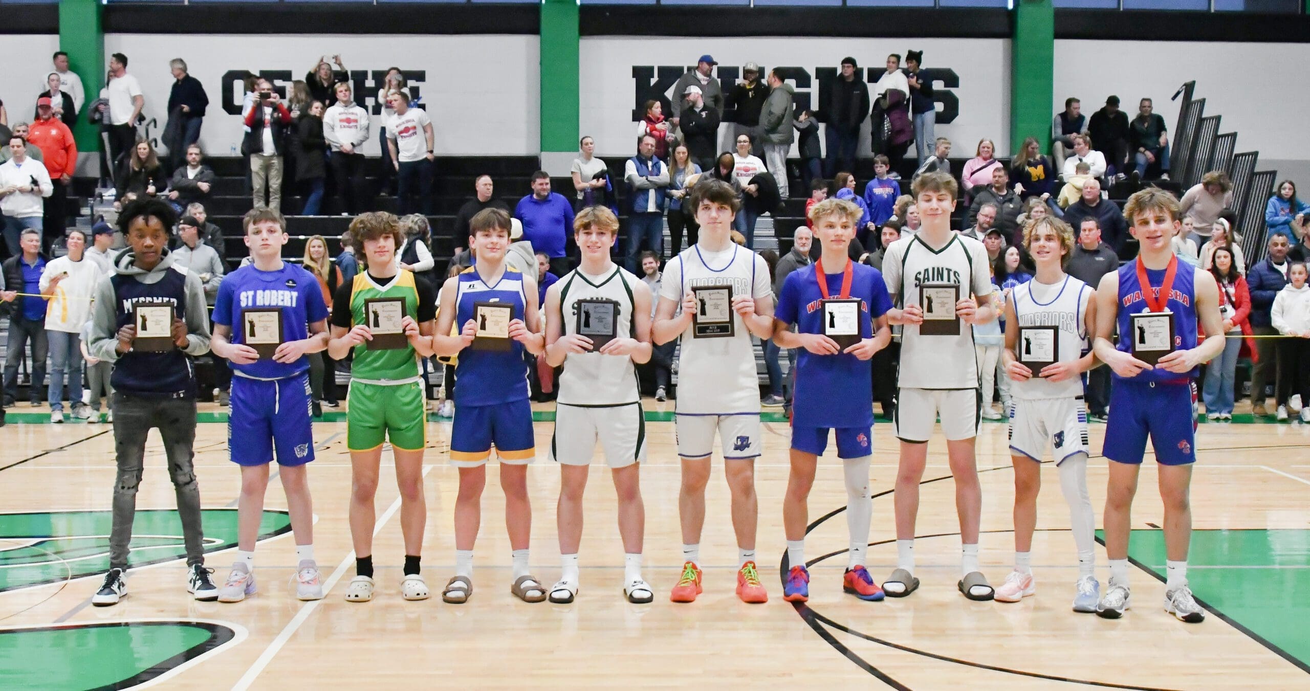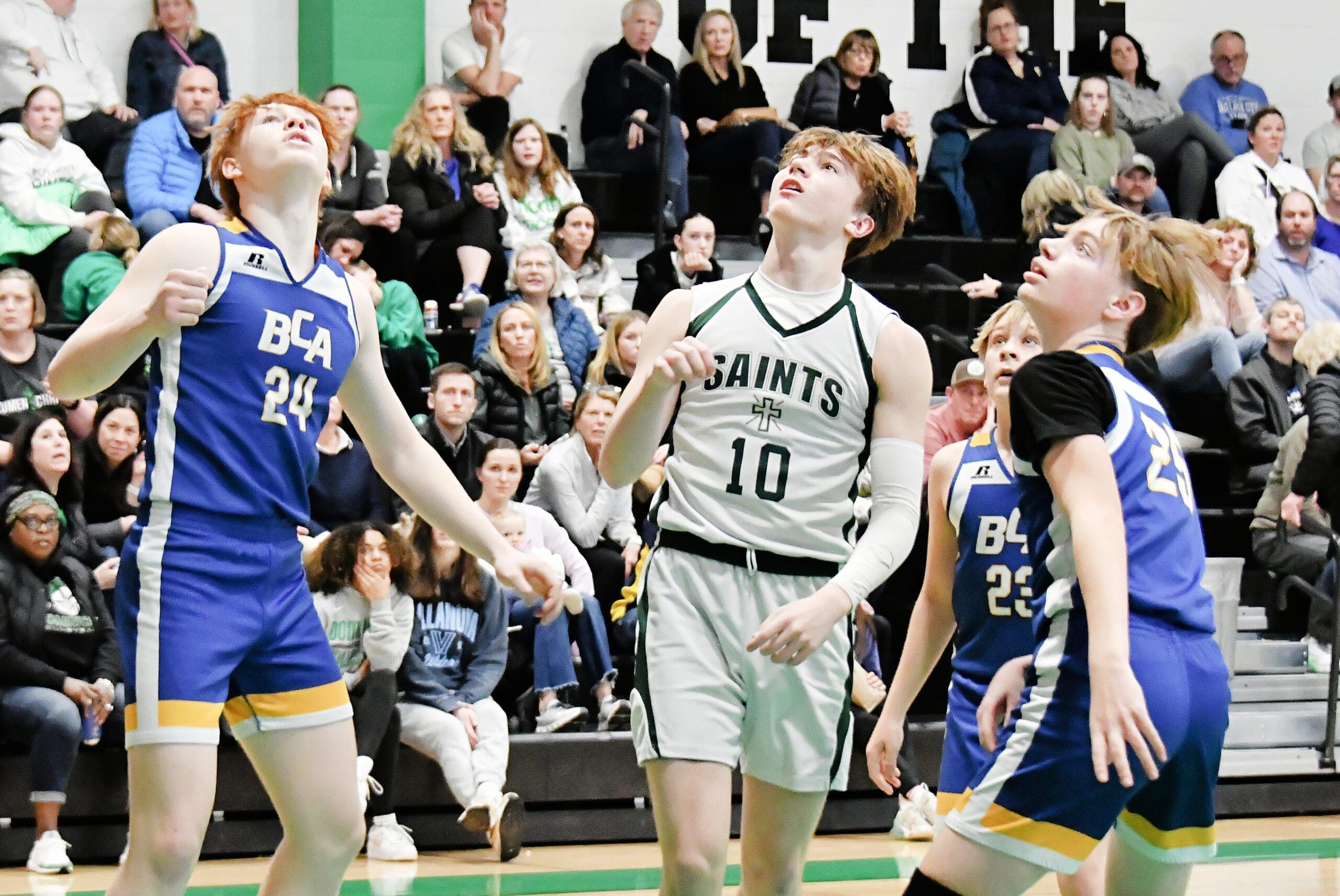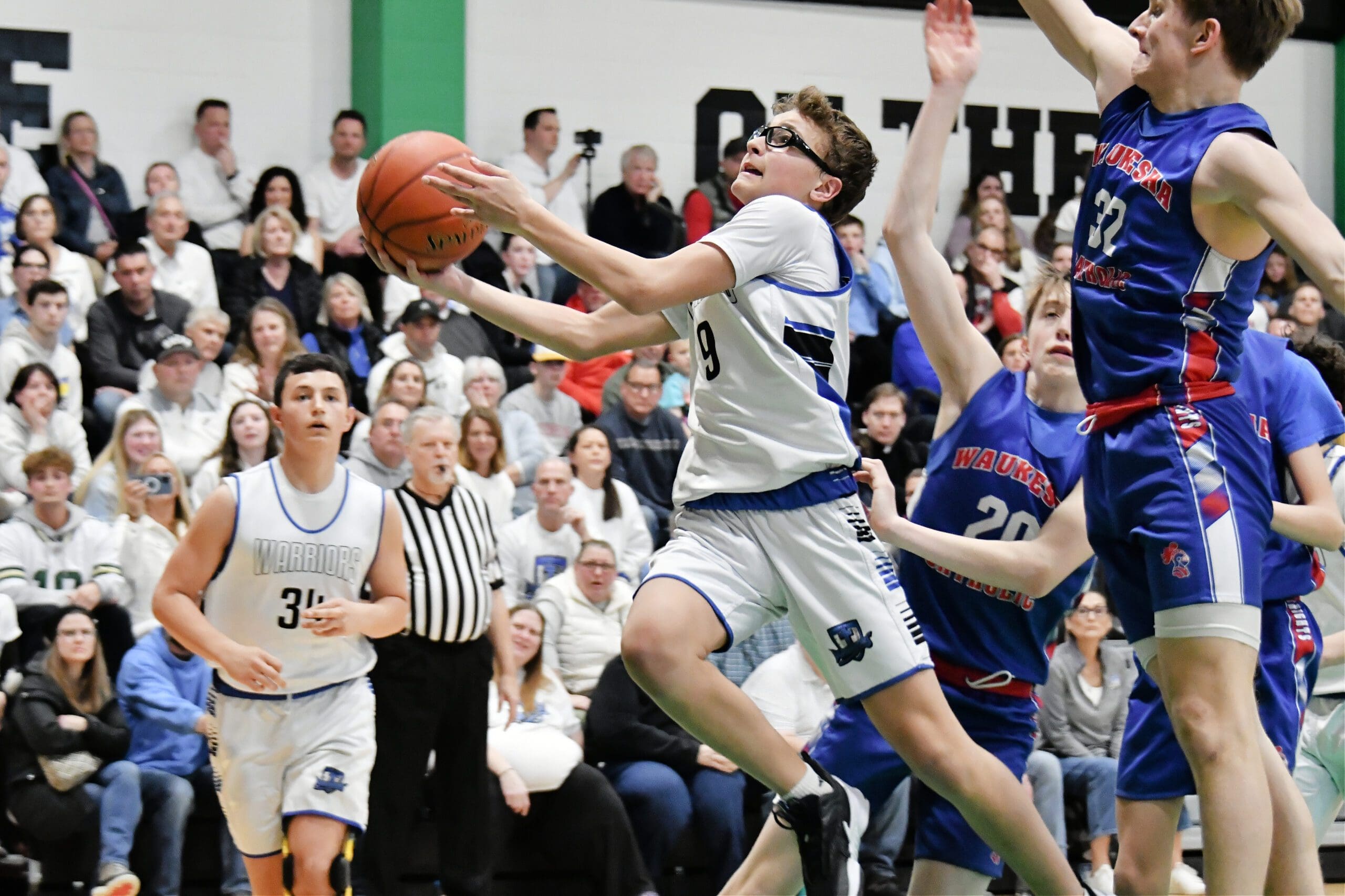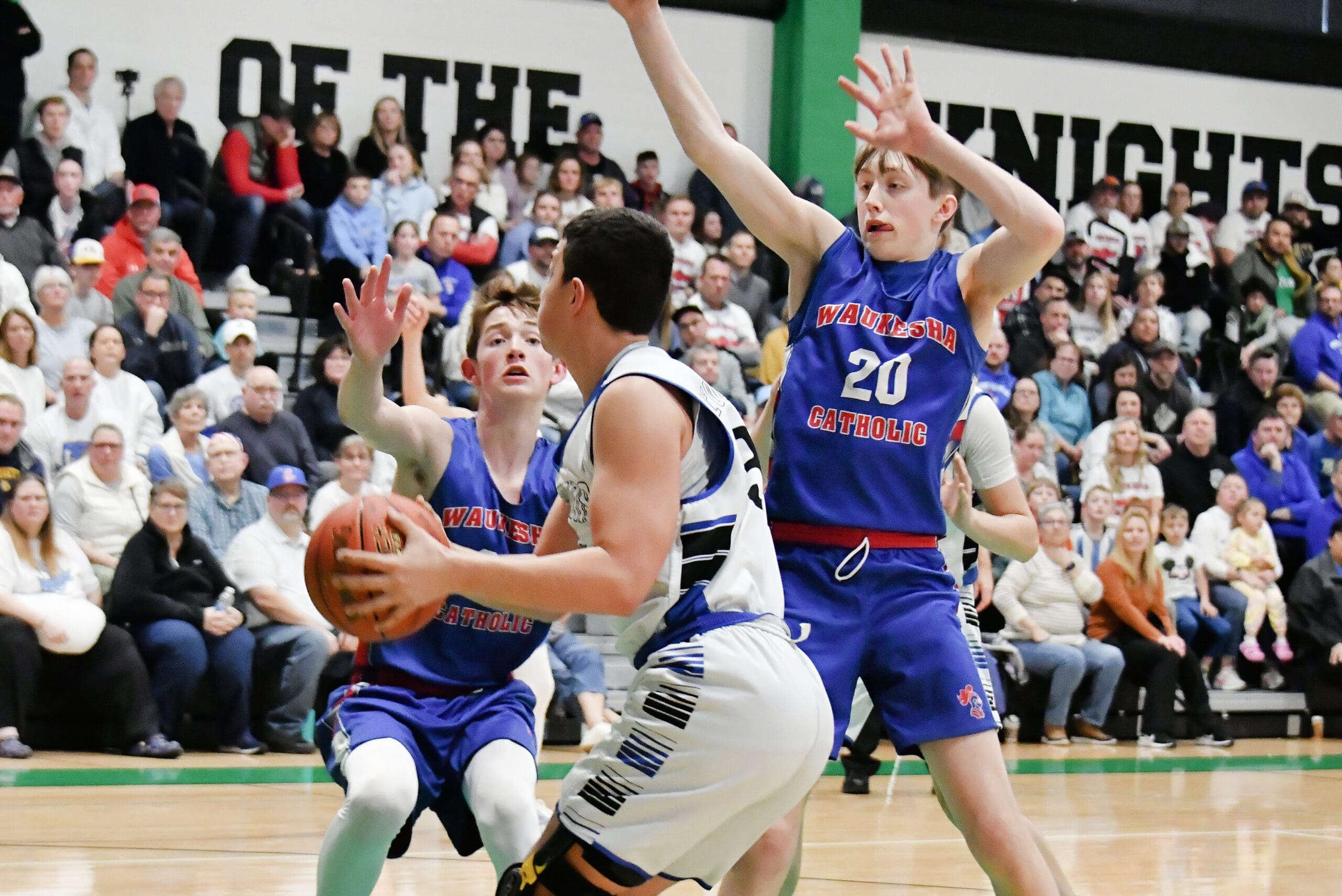 In the championship game of the Padre Serra Boys Basketball Tournament, the St. Mary (Menomonee Falls) Warriors defeated Waukesha Catholic, 50-36, on Sunday, March 24, at Dominican High School, Whitefish Bay. One of the largest grade-school basketball tournaments in the nation, the Padre Serra is run by the Serra Club of Milwaukee, with proceeds benefitting vocations in the Archdiocese of Milwaukee. In the third-place game, Lumen Christi, Mequon, defeated Burlington Catholic, 42-36. (Photos by David Bernacchi)