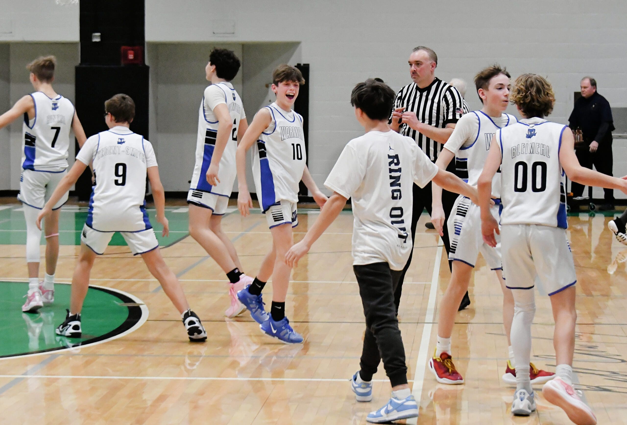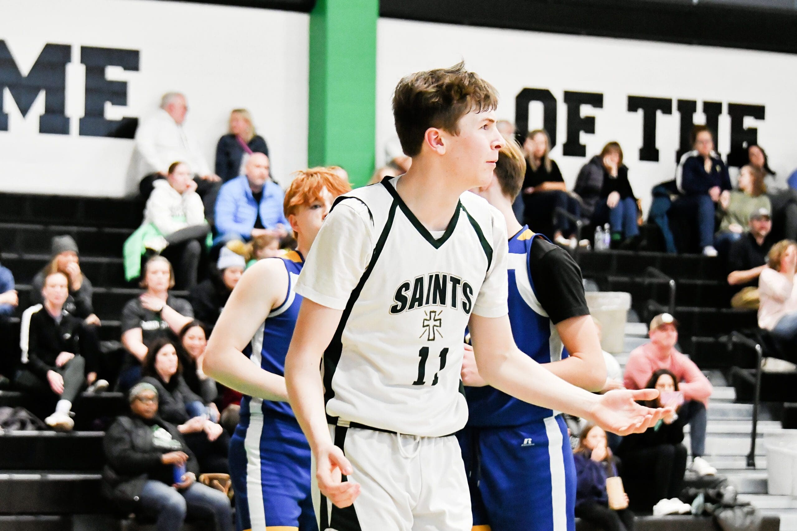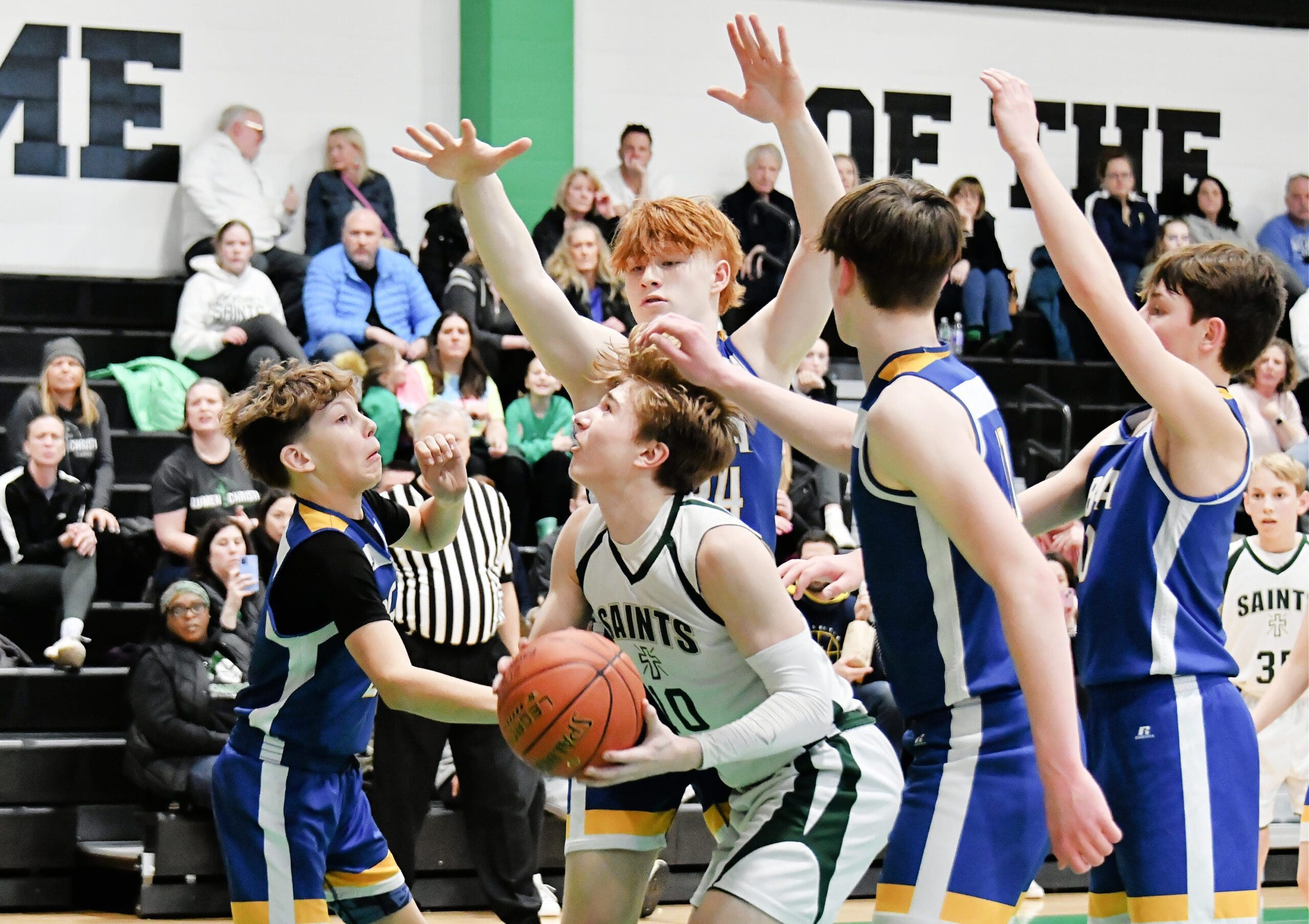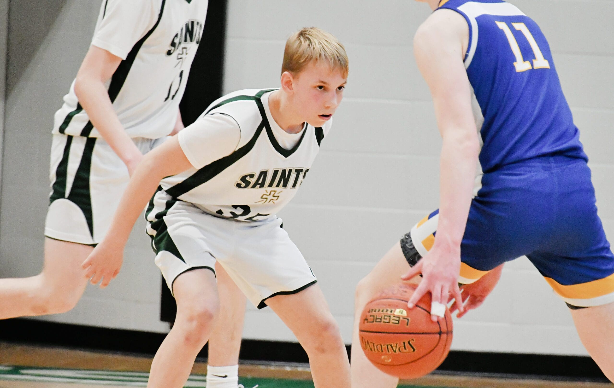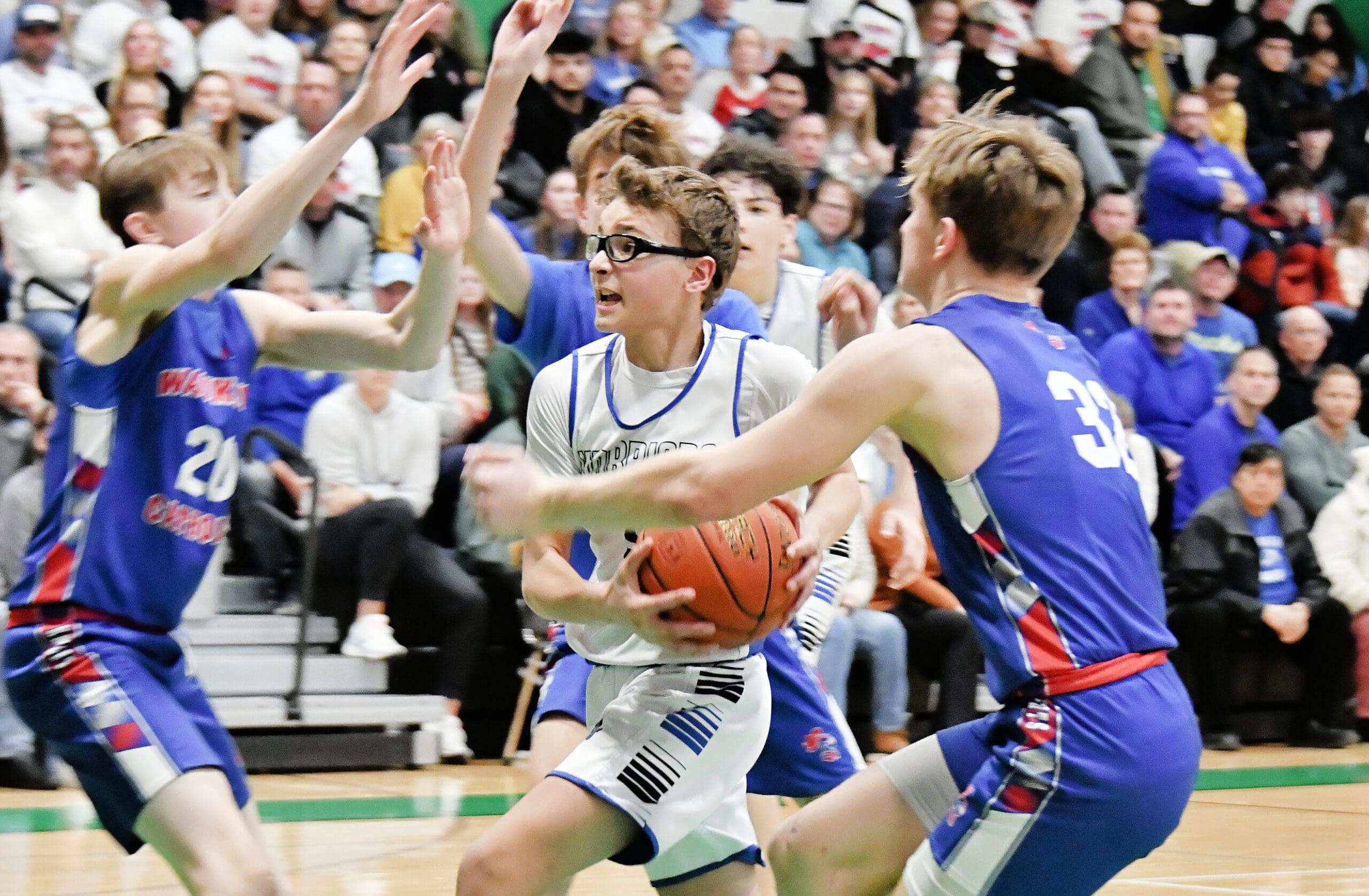 In the championship game of the Padre Serra Boys Basketball Tournament, the St. Mary (Menomonee Falls) Warriors defeated Waukesha Catholic, 50-36, on Sunday, March 24, at Dominican High School, Whitefish Bay. One of the largest grade-school basketball tournaments in the nation, the Padre Serra is run by the Serra Club of Milwaukee, with proceeds benefitting vocations in the Archdiocese of Milwaukee. In the third-place game, Lumen Christi, Mequon, defeated Burlington Catholic, 42-36. (Photos by David Bernacchi)