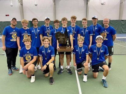 The Catholic Memorial boys tennis team won its first WIAA state team championship with a 4-3 victory over Brookfield Academy at Sports Core in Kohler. (Submitted photo)