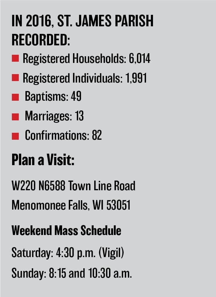 While each individual faith community shares in the work of the Church, each of these communities brings its unique history, gifts and perspective to our common mission of proclaiming the Gospel. The community of St. James Church in Menomonee Falls has been living out this mission since 1841. Today, this vibrant Waukesha County parish celebrates its faith through commitment to liturgy, parish life and hospitality, “journeying toward the Kingdom” through worship, formation and service.