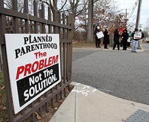 Pro-life advocates participate in a prayer vigil in January near the entrance to a Planned Parenthood clinic in Smithtown, N.Y., that performs abortions. An AP survey shows that the number of abortions has declined in most states. (CNS photo/Gregory A. Shemitz)