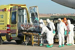 Health workers put Ebola patient, Father Miguel Pajares of Spain, into an ambulance Aug. 7 at a military air base in Madrid, after he was repatriated from Liberia for treatment. Ghana’s bishops have urged the government to be extra vigilant in screening people who enter the country by sea for signs of Ebola.(CNS photo/Ministry of Defense handout via Reuters)