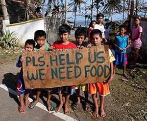 Children display a sign asking for food from motorists by the side of a road in Dolores, Philippines, in Eastern Samar province, Dec. 8. (CNS photo/Erik De Castro, Reuters)