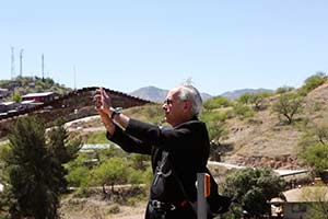 Bishop Mark J. Seitz of El Paso, Texas, takes a photo of the border fence near Nogales, Ariz., March 31. A group of U.S. bishops visited the border area to celebrate Mass, talk with migrants and recall the thousands who have died attempting to cross the Arizona desert. They also used the opportunity to again appeal for changes in the U.S. immigration system. (CNS photo/Nancy Wiechec)Seitz said. “They (violent gangs) act with impunity, threatening families. … Violence is the straw that stirs the drink.”