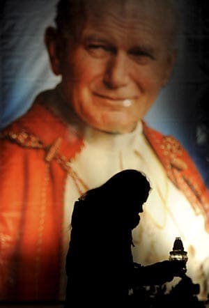 A large image of Blessed John Paul II is seen as a woman attends a prayer vigil at Pilsudski Square in Warsaw, Poland, April 2. The vigil marked the ninth anniversary of the Polish pope’s death. (CNS photo/Bartlomiej Zborowski, EPA)