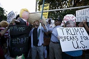 Opponents and supporters of Republican presidential candidate Donald Trump demonstrate outside a Los Angeles hotel July 10. (CNS photo/Lucy Nicholson, Reuters)He recalled teaching college students about nativism – the policy of protecting the interests of native-born inhabitants against those of immigrants – and telling students it was “a continual virulent strain in the American psyche, which would probably sadly show up again.”