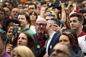 People react in Dublin as Ireland votes in favor of same-sex marriage May 23. In an interview with Catholic News Service Fr. Paul Check, director of a church apostolate that ministers to homosexuals, said the Catholic Church not only needs to provide pastoral care for those with same-sex attraction but it should also make its teaching “accessible, understandable and compelling for people.” (CNS photo/Cathal McNaughton, Reuters)