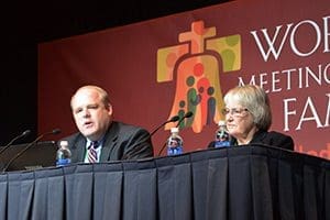 Ron Belgau and his mother, Beverley Belgau, speak at the World Meeting of Families in Philadelphia Sept. 24. Belgau and his mother described what it was like for them dealing with Ron’s same-sex attraction. (CNS photo/Madi Alexander, Religion News Service)experiences on his “Spiritual Friendship” log, http://spiritualfriendship.org.
