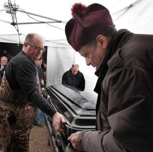 Chicago Auxiliary Bishop Joseph N. Perry, postulator for the sainthood cause of Father Augustus Tolton, foreground, and Bishop Thomas J. Paprocki of Springfield, Ill., back right, seal the new casket bearing the remains of Fr. Tolton after they were exhumed and verified Dec. 10 at St. Peter Cemetery in Quincy, Ill. Fr. Tolton, a sainthood candidate, was a former slave who died in Chicago in 1897. He is the first recognized American diocesan priest of African descent. (CNS photo/Karen Callaway, Catholic New World)