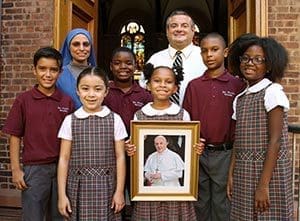 Mother Myriam Almah, an Incarnate Word sister and religion teacher, and Joseph Muscente, principal of St. Paul School in New York City’s East Harlem community, pose with students selected to meet Pope Francis when he visits their neighborhood Sept. 25. Front row: Emely Rodriguez, left, Mia Waterman and Lori Jeudy. Middle row: Benjamin Grassia, Charles Orajiaka and Nicholas Vargas. (CNS photo/Gregory A. Shemitz)
