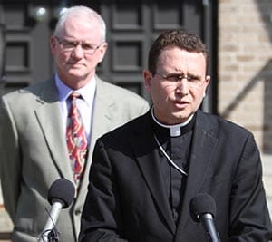 Auxiliary Bishop Andrew H. Cozzens of St. Paul and Minneapolis speaks during a June 5 news conference outside of the chancery after the Ramsey County Attorney’s Office criminally charged the archdiocese for failing to protect children. Behind him is Judge Tim O’Malley, archdiocesan director of ministerial standards and safe environment. (CNS photo Dave Hrbacek, The Catholic Spirit)