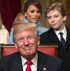 U.S. President Donald Trump smiles as he is joined by the congressional leadership and his family as after formally signing his Cabinet nominations into law Jan. 20 at the U.S. Capitol in Washington. (CNS photo/J. Scott Applewhite, pool via Reuters)