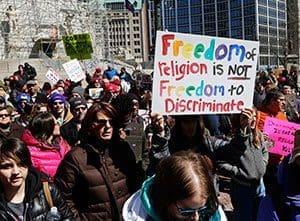 Demonstrators rally at Monument Circle in Indianapolis March 28 to protest a religious freedom bill signed in to law by Indiana Gov. Mike Pence. More than 2,000 people gathered at the state Capitol to protest Indiana’s Religious Freedom Restoration Act b ecause they say it would promote discrimination against individuals based on sexual orientation. (CNS photo/Nate Chute, Reuters) “With the passage of this legislation, we ensure that Indiana will continue to be a place where we respect freedom of religion,” he said, “and make certain that government action will always be subject to the highest level of scrutiny that respects the religious beliefs of every Hoosier of every faith.”
