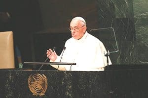 Pope Francis addresses the General Assembly of the United Nations in New York Sept. 25. (CNS photo/Paul Haring)government leaders and U.N. officials to keep the dignity and sacredness of every human life and the value of all creatures at the center of their concern.