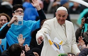 Pope Francis gestures as he arrives to lead his general audience in St. Peter’s Square at the Vatican Dec. 3. (CNS photo/Paul Haring)