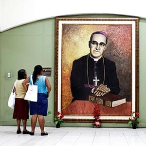 People look at a painting of slain Salvadoran Archbishop Oscar Romero at the cathedral in San Salvador Feb. 3. (CNS photo/Jose Cabezasi, Reuters)Seven years later, Pope Francis – the first Latin American pope – told reporters that “for me, Romero is a man of God.” However, he said at the time, “the process must go ahead, and God must give his sign. If he wants to do so, he will.”