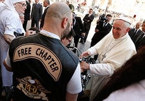 After Mass, Pope Francis followed his usual practice of individually greeting a number of disabled persons among the congregation. On a lighter note, the pope also offered a general greeting to hundreds of Harley-Davidson enthusiasts who attended the Mass in their biker vests during a Rome celebration of the motorcycle's 110th anniversary.
