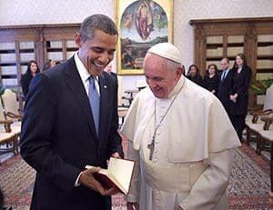 U.S. President Barack Obama accepts a gift from Pope Francis during a private audience at the Vatican March 27. The pope gave the president a copy of his apostolic exhortation, “Evangelii Gaudium” (“The Joy of the Gospel”). (CNS photo/Stefano Spaziani, pool) “During the visit, the president and the pope will continue the dialogue, which they began during the president’s visit to the Vatican in March 2014, on their shared values and commitments on a wide range of issues,” said a statement released March 26 by the Office of the Press Secretary at the White House.