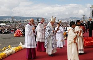 Pope Francis celebrates Mass in Bicentennial Park in Quito, Ecuador, July 7. (CNS photo/Paul Haring)After a 12-hour flight from Rome, the pope participated in a brief welcoming ceremony at Quito’s Mariscal Sucre Airport, telling government dignitaries, bishops and special guests that his pastoral work before becoming pope had taken him to Ecuador many times.