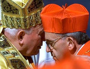 Pope John Paul II embraces Argentine Cardinal Jorge Bergoglio after presenting the new cardinal with a red beretta at the Vatican Feb. 21, 2001. It was the Polish pontiff’s choice of cardinals that would help set the stage for the eventual election of Cardinal Bergoglio (Pope Francis) following the resignation of Pope Benedict XVI. (CNS photo/Reuters)