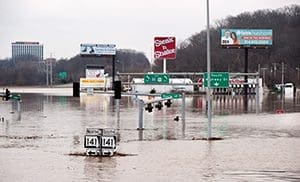 Floodwaters from the nearby Meramec River fill the traffic lanes of I-44 and Missouri Route 141 Dec. 30 in Valley Park, just outside St. Louis. Pope Francis called on Christians to pray for victims of several natural disasters that have hit parts of the United States, Great Britain and Paraguay. (CNS photo/Sid Hastings, EPA)The levee gate was built to withstand a crest of 42 feet and 6 inches, a foot lower than the Army Corps of Engineers predicted crest of 43 feet and 6 inches between midnight of that day and 6 a.m. Dec. 31. The levee itself could withstand a 44-foot crest. The record crest was 39, set in 1982.