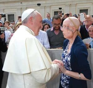 Pope Francis greets Cheryl Tobin, who had stage IV cancer, during his general audience at the Vatican May 11. Tobin died in her sleep New Year’s Eve. She was 48. (CNS photo/L’Osservatore Romano)