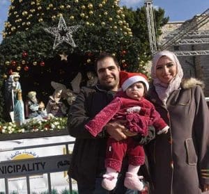 Ashraf and Shahad Natsheh, who are also Muslim, took the afternoon to come from Hebron, West Bank, to take pictures of their 10-month-old daughter Na’ara in front of the official Bethlehem Christmas tree with its life-sized creche and gold-colored ornaments.