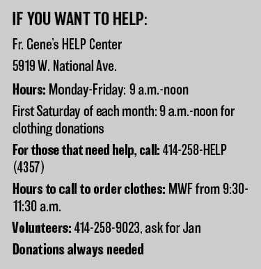 Fr. Gene’s HELP Center, 5919 W. National Ave, is a non-profit, non-denominational charitable group that gives clothes to the poor.
