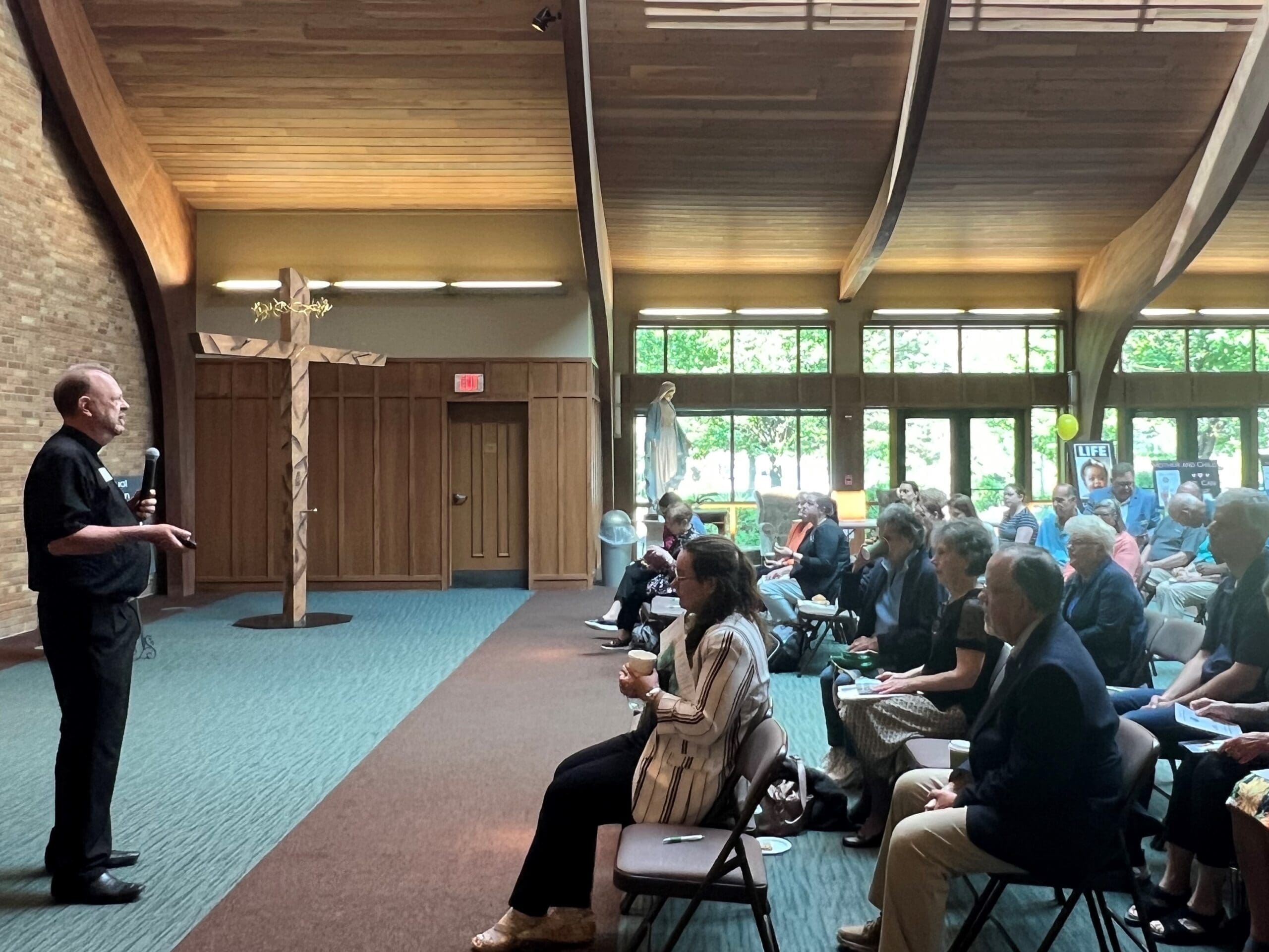 Dcn. Jim Matthias, Director of the Respect Life Ministry for the Archdiocese of Milwaukee, addresses people gathered June 17 at St. Mary’s Visitation, Elm Grove, to promote collaboration among pro-life groups and initiatives. (Submitted photo)