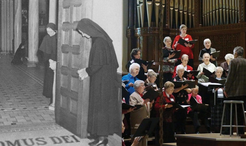 Novices dusted and cleaned (above left) St. Joseph Chapel weekly. (Submitted photo courtesy SSSF Archives) Four liturgical musical works (above right) were premiered at the centennial liturgy. The SSSF Chapel Singers performed under the direction of Sister Bernadette Luecker. (Submitted photo courtesy Betty Lewis)