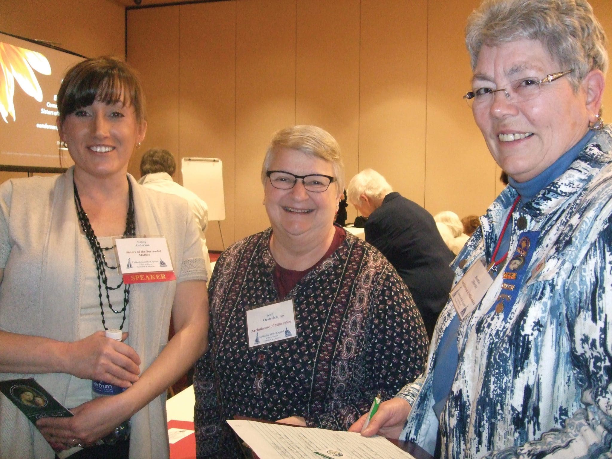 Communications Director of the Sisters of the Sorrowful Mother, Emily Anderson, left, talks with Sr. Ann Oestreich, IHM, of U.S. Catholic Sisters Against Human Trafficking, center, and Bea Sikorski, president of the Milwaukee Archdiocesan Council of Catholic Women, after the breakout session on ending human trafficking at Catholics at the Capitol at the Monona Terrace in Madison on March 28. (Catholic Herald photo/Mary C. Uhler)